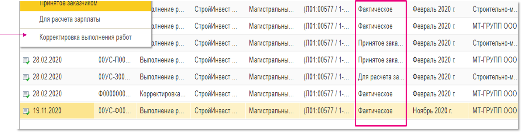 • Предустановлено два вида операций: фактическое выполнение; выполнение, принятое заказчиком;