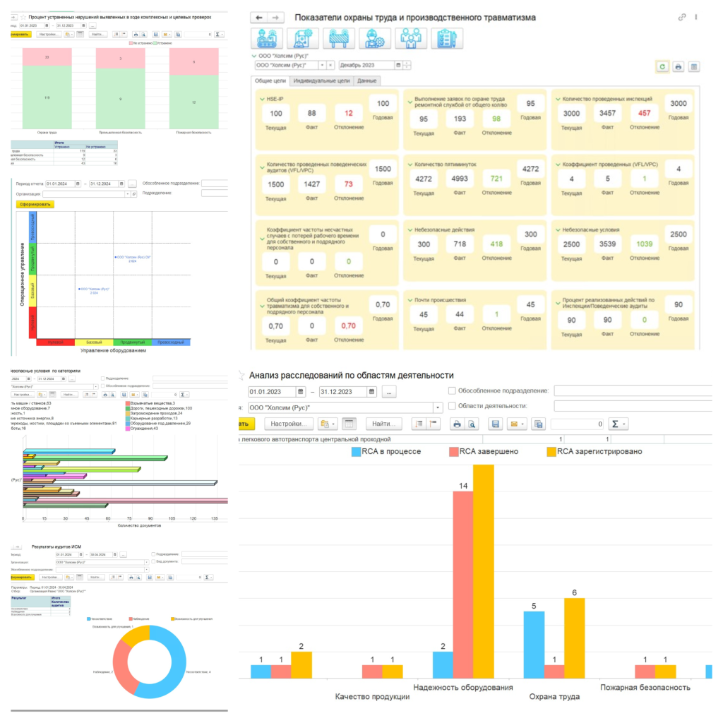 В рамках данного блока ведется работа по установки целей (общие цели по площадкам и индивидуальные цели сотрудников). Используя дашборды и аналитические отчеты осуществляется контроль за отклонениями от установленных целях. Данное решение также было направлено на поощрение сотрудников за соблюдение правил безопасности труда. Эта мера является одной из главных задач в рамках цели достижения нулевого травматизма. Такой подход нацелен на создание безопасной рабочей среды, где каждый работник осознает важность соблюдения правил безопасности как для себя, так и для своих коллег.
