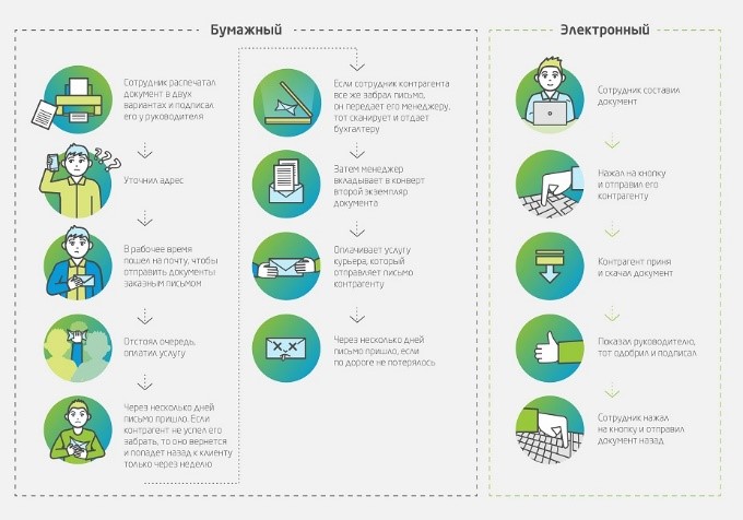 Система электронного документооборота позволяет создавать, согласовывать и обмениваться документами. Процесс похож на тот, что используется в бумажном делопроизводстве. Работает это просто. Разберем на примере: Сотрудник вашей компании создает электронный документ в 1С. Нажимает кнопку «Сформировать, подписать и отправить». Документ отправляется в систему ЭДО, информация поступает оператору, который предоставляет сервис. Все происходит в режиме реального времени. Ваш клиент получает документ в своей системе, проверяет его и нажимает на кнопку «Провести». На рисунке ниже наглядно видно, насколько электронный документооборот сокращает количество действий.