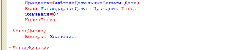 Создадим экспортную процедуру для заполнения периода, указанного датами его начала и окончания, рабочим и нерабочим временем и функцией, создающей наборы записей регистра сведений ГрафикиРаботы.