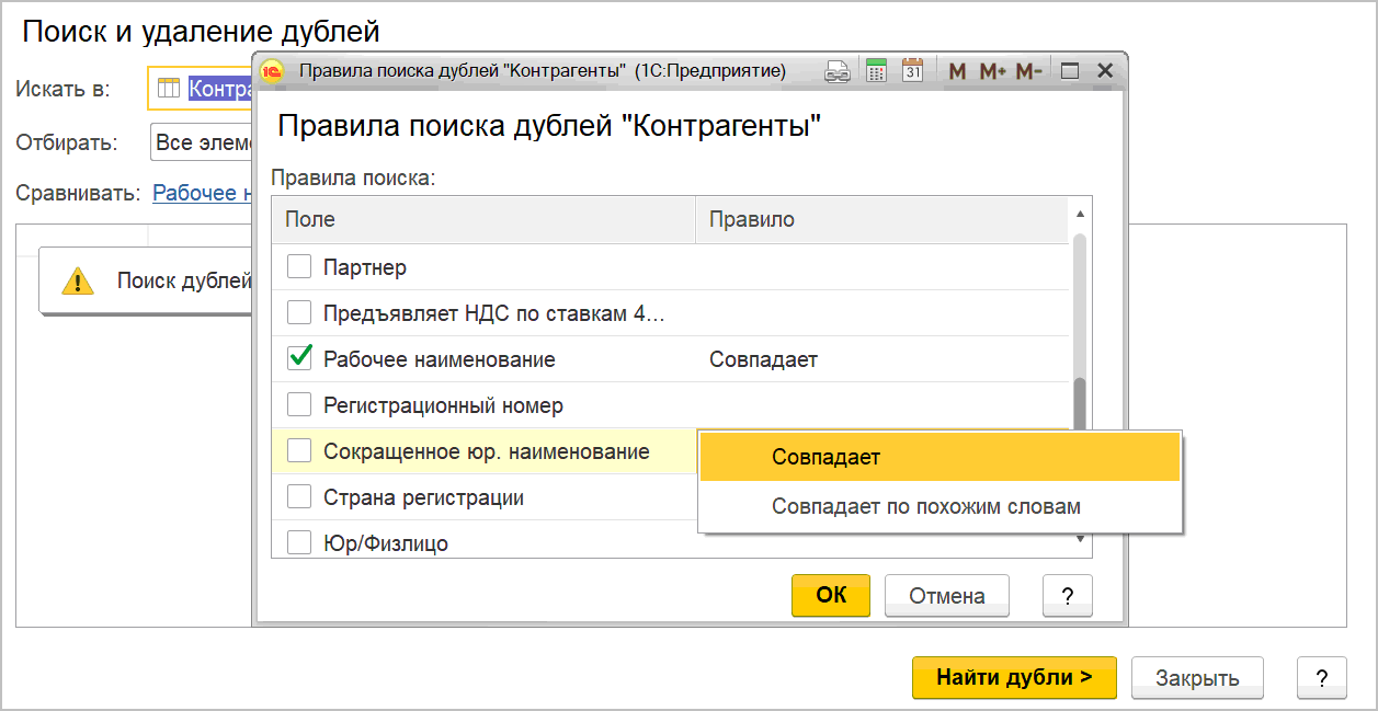 - По ссылке в поле Сравнивать откроется форма Правила поиска дублей. Отметьте флажками реквизиты, при совпадении которых элементы будут считать дублями. Выберите, какое совпадение засчитывать в случае каждого из реквизитов – полное (Совпадает) или частичное (Совпадает по похожим словам).