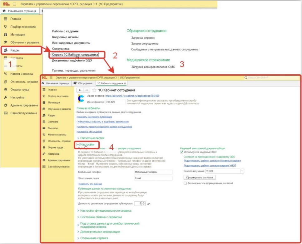 Для ознакомления сотрудников с согласием на присоединение к кадровому электронному документообороту в вашей базе 1С существует специальный механизм. Переходим в раздел «Кадры» «Сервис 1С:Кабинет сотрудника» «Настройки» (рис. 1)