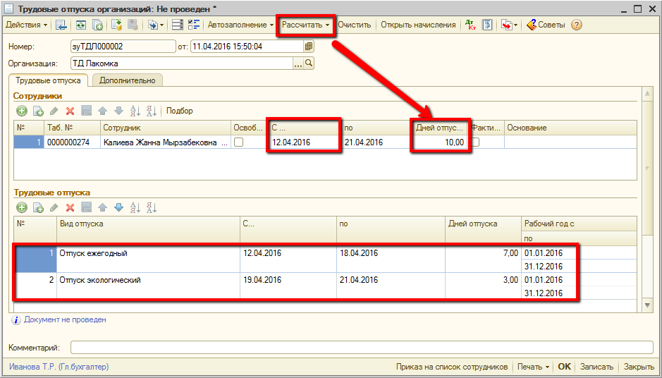 - Нажмите «Рассчитать» → «Рассчитать отпуск».