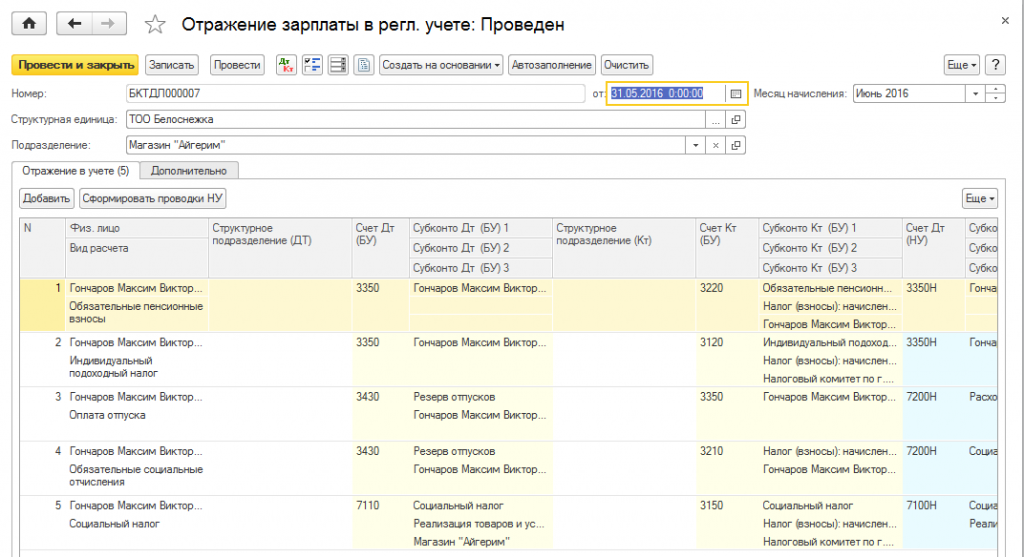 Чтобы данные по начислениям и удержаниям попали на счета бухгалтерского и налогового учета, создайте документ:
