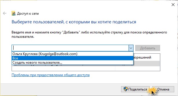 Шаг седьмой. Выберите пользователей, для которых будет открыт доступ к папке, и нажмите на кнопку «Поделиться». Таким образом папке будет задано сетевое имя.