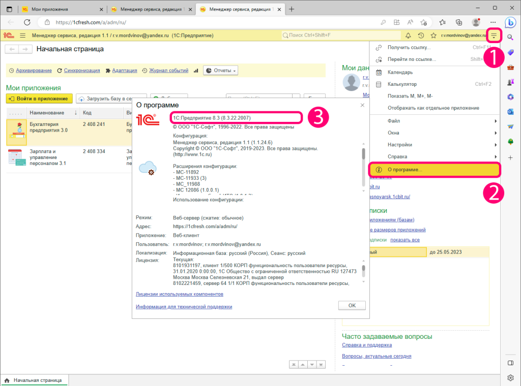 Для определения нужной версии тонкого клиента перейдите в личный кабинет сервиса 1С:Фреш.