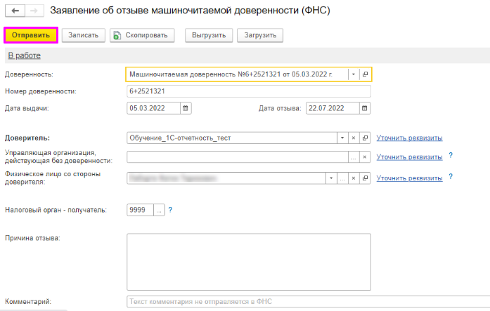 На следующем шаге проверьте заполненные данные, укажите причину отзыва и нажмите кнопку «Отправить»: