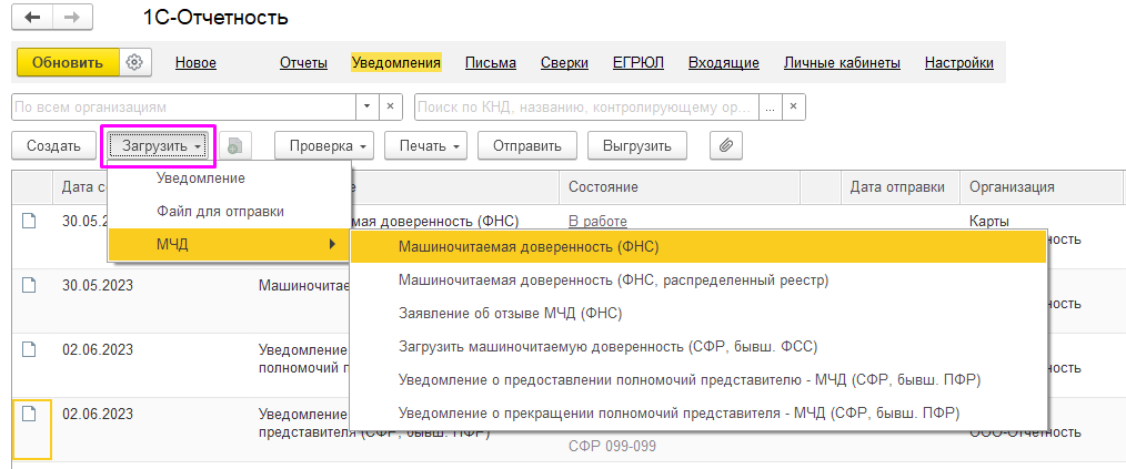 Если МЧД зарегистрирована в одной информационной базе, а использовать нужно в другой, зарегистрированную МЧД можно загрузить. На вкладке Уведомления нажмите «Загрузить» (1) - МЧД (2) - Загрузить машиночитаемую доверенность (СФР, бывш. ФСС) (3):