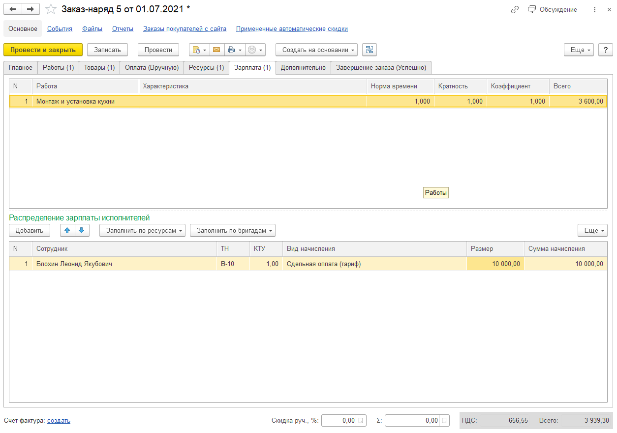 Следующая для заполнения вкладка — «Зарплата», в которую вносится информация об услуге или работе и о том, кто ее выполнял. Здесь же производится расчет зарплаты и заполняются такие графы: