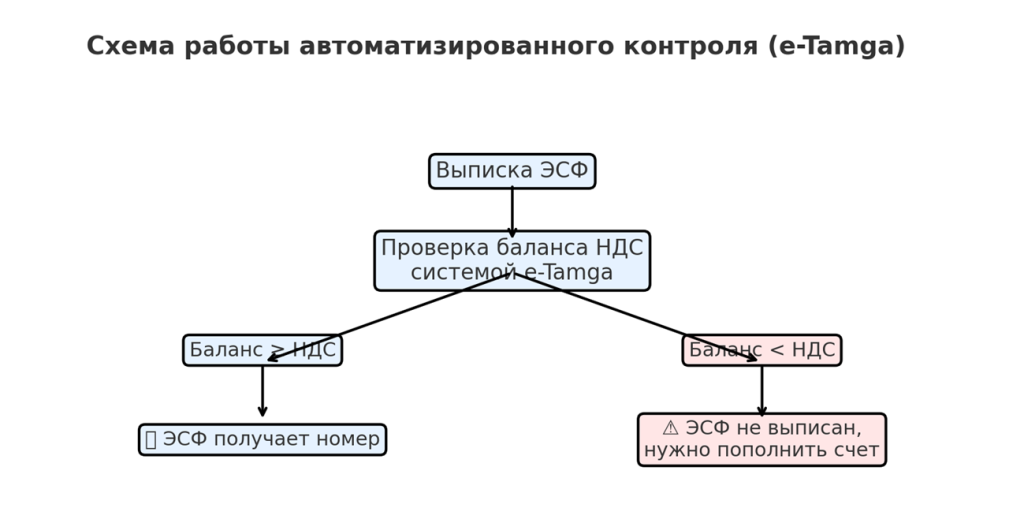 Автоматизированный контроль — это процесс, при котором система e-Tamga автоматически присваивает регистрационный номер электронному счету-фактуре (ЭСФ) только при наличии достаточного остатка НДС на специальном налоговом счете.