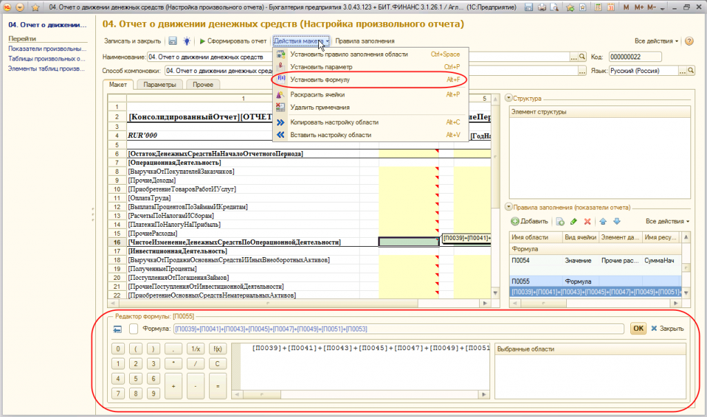 Так же для любой ячейки в макете отчета можно задавать произвольные формулы. Редактор формул открывается при команде «Действие макета» - «Установить формулу»: