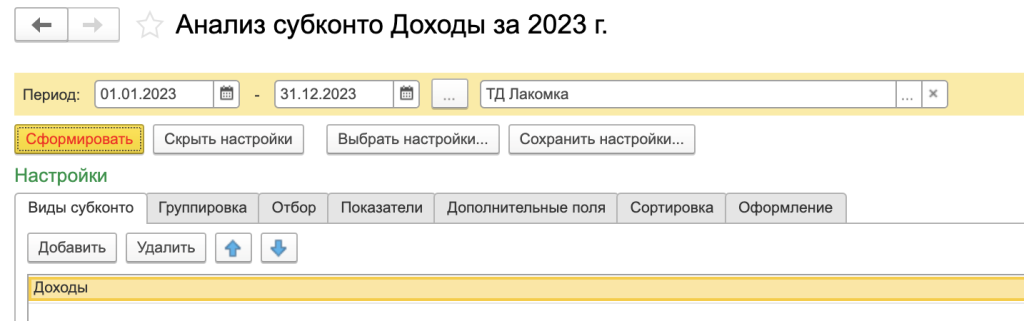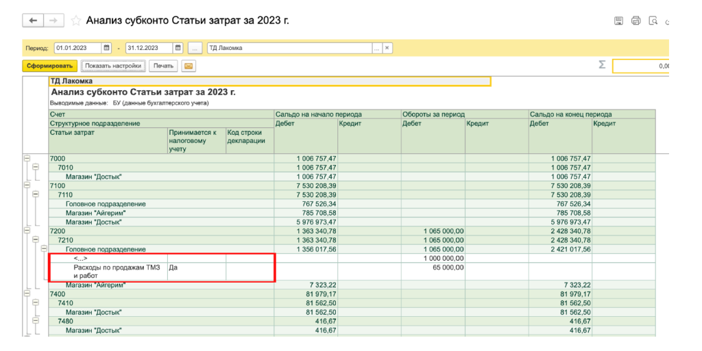 Таким образом можно проанализировать те статьи затрат и доходы, где есть обороты и не указаны коды строк декларации, а также те документы, где не заполнена аналитика.