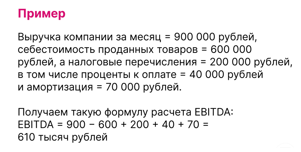 1. EBITDA - это прибыль компании до вычета налоговых обязательств, процентов по займам и амортизационных отчислений. Этот финансовый показатель нужен для анализа финансовой результативности предприятия. Чем он выше, тем лучше идут дела в бизнесе.