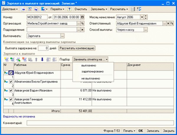 Формирование и заполнение данного документа будет осуществляться в автоматическом режиме. В нем можно регистрировать выплату через кассу компании, а также посредством безналичного начисления денежных средств на счета сотрудников в банке. Зарплату, которая не была получена в срок, можно регистрировать как задепонированную.