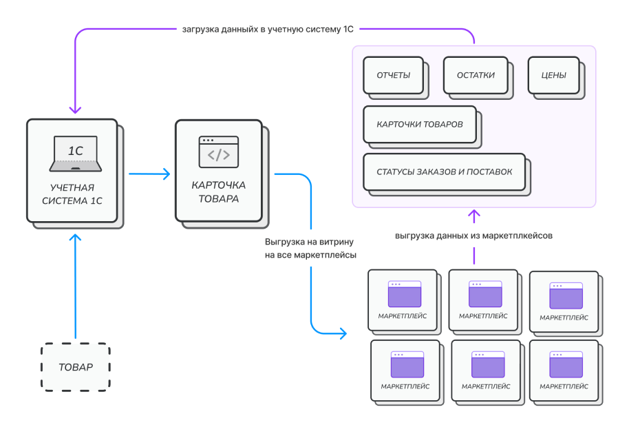 В систему выгружаются карточки маркетплейсов и настраивается их связь с номенклатурой. При этом в 1С подтягивается вся информация о товаре: описание, фотографии, артикулы, характеристики, цены и остатки.