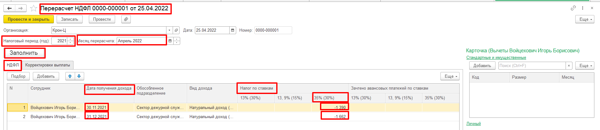 В поле «Налоговый период (год)» указываем период, за который делаем перерасчет – 2021 год. Месяц перерасчета - Апрель 2022 года. Кнопка «Заполнить». Налог НДФЛ за прошлые периоды сторнируется автоматически.