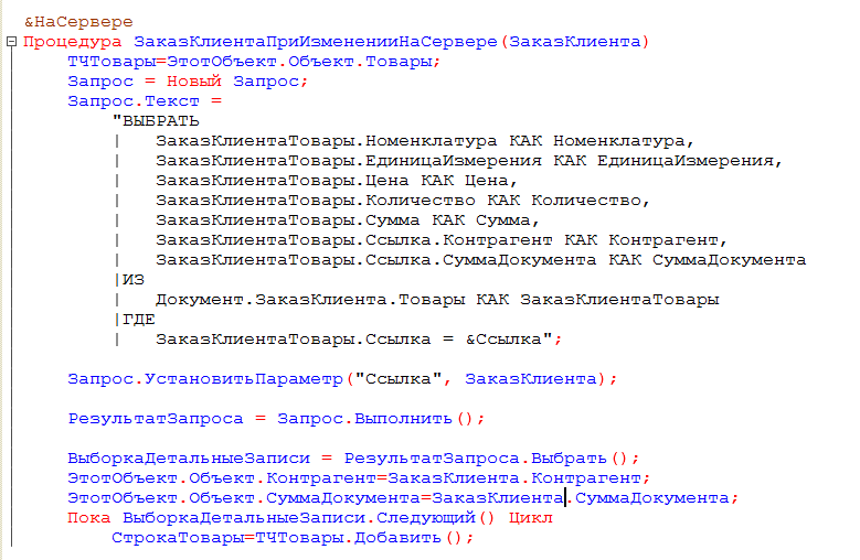 Напишем процедуру обработчик выбора Заказа клиента, которая заполнит реквизиты документа Реализация товаров.