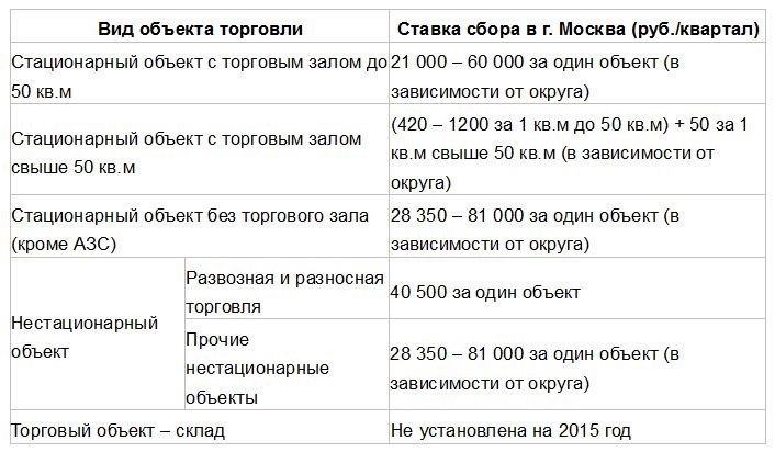 На 2015 год в г. Москве установлены ставки сбора для всех видов торговли, кроме отпуска товаров со склада. Таким образом, торговым организациям и ИП остается определить вид своего объекта, его местоположение и итоговую сумму сбора.